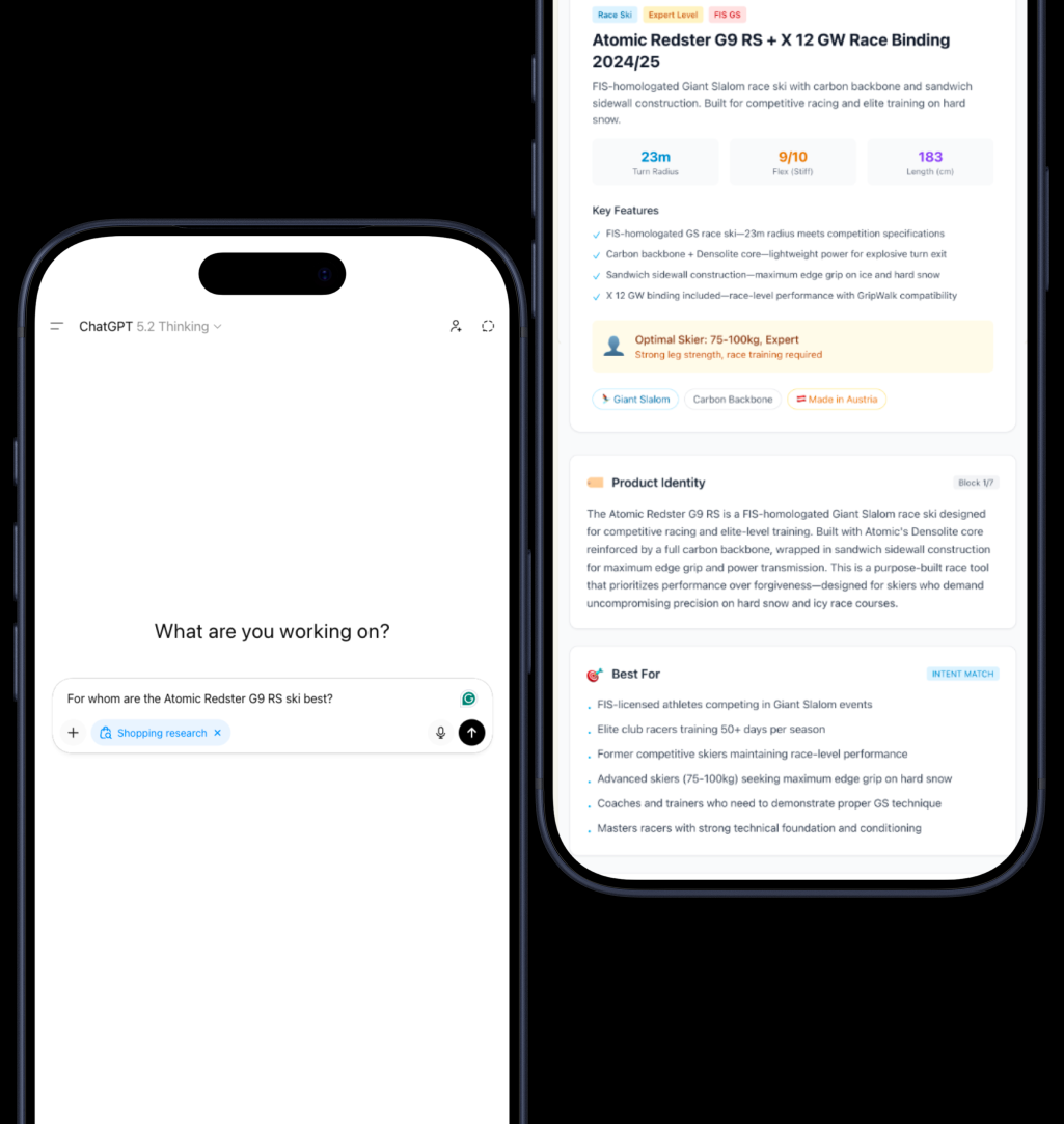 We translate technical specs into customer-centric benefits using proprietary consumer research. AI agents get filterable attributes. Shoppers get answers to real questions. Both get what they need to transact.